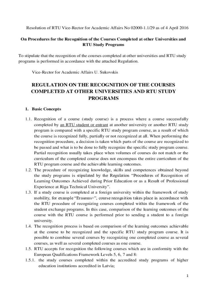 Resolution of RTU Director for Academic Affairs No 020001.1/29 as of 4 April 2016