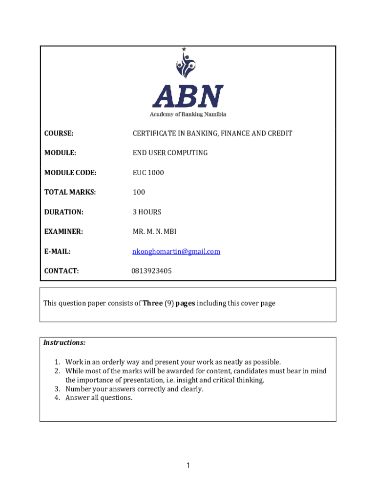 COURSE:CERTIFICATE IN BANKING, FINANCE AND CREDITMODULE:END USER COMPUTINGMODULE CODE:EUC 1000TOTAL MARKS:100DURATION:3 HOURSEXAMINER:MR. M. N. EMAIL:nkonghomartin@gmail.noncontact:0813923405This