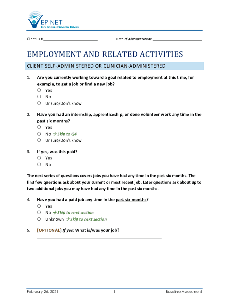 Client ID #Date of Administration:EMPLOYMENT AND RELATED ACTIVITIES CLIENT SELFADMINISTERED OR CLINICIANADMINISTERED 1. Are you currently working toward a goal related to employment at this time,