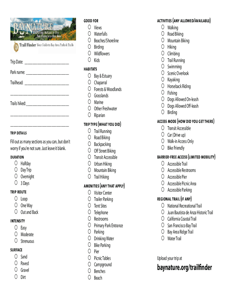 Good FORTRAN Date: ___ Park name:___Views Waterfalls Beaches/Shoreline Birding Wildflowers Kidshabitats______trip type (what you did)Trailhead:___ ___ Trails hiked:___trip details Fill out as many