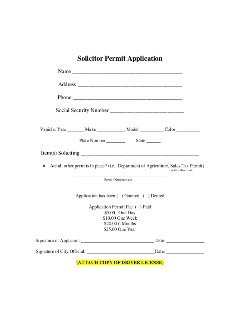 Solicitor Permit Application Name ___ Address ___ Phone ___ Social Security Number ___ Vehicle: Year ___ Make ___ Model ___ Color ___ Plate Number ___State ___Item(s) Soliciting ___ Are all other