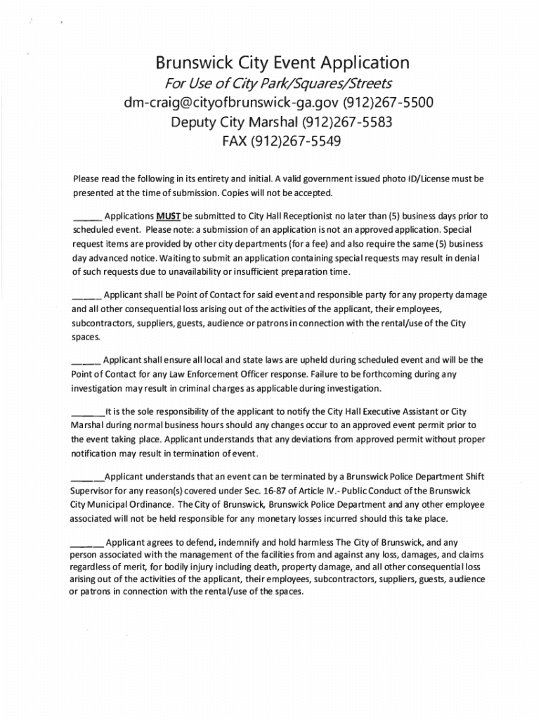 Brunswick City Event Application For Use of City Park/Squares/Streetsdmcraig@cityofbrunswickga.gov (912)2675500 Deputy City Marshal (912)2675583 FAX (912)2675549 Please read the following in its entirety