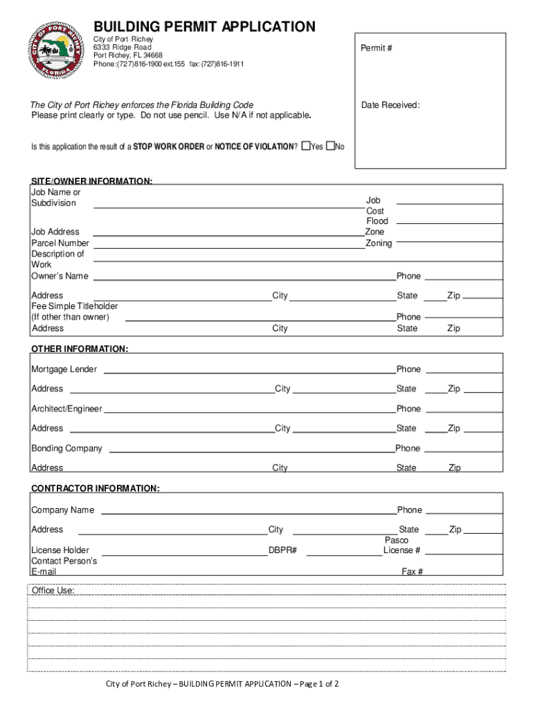 BUILDING PERMIT APPLICATION City of Port Richey 6333 Ridge Road Port Richey, FL 34668 Phone:(727)8161900 ext.155 fax: (727)8161911Permit #The City of Port Richey enforces the Florida Building Code