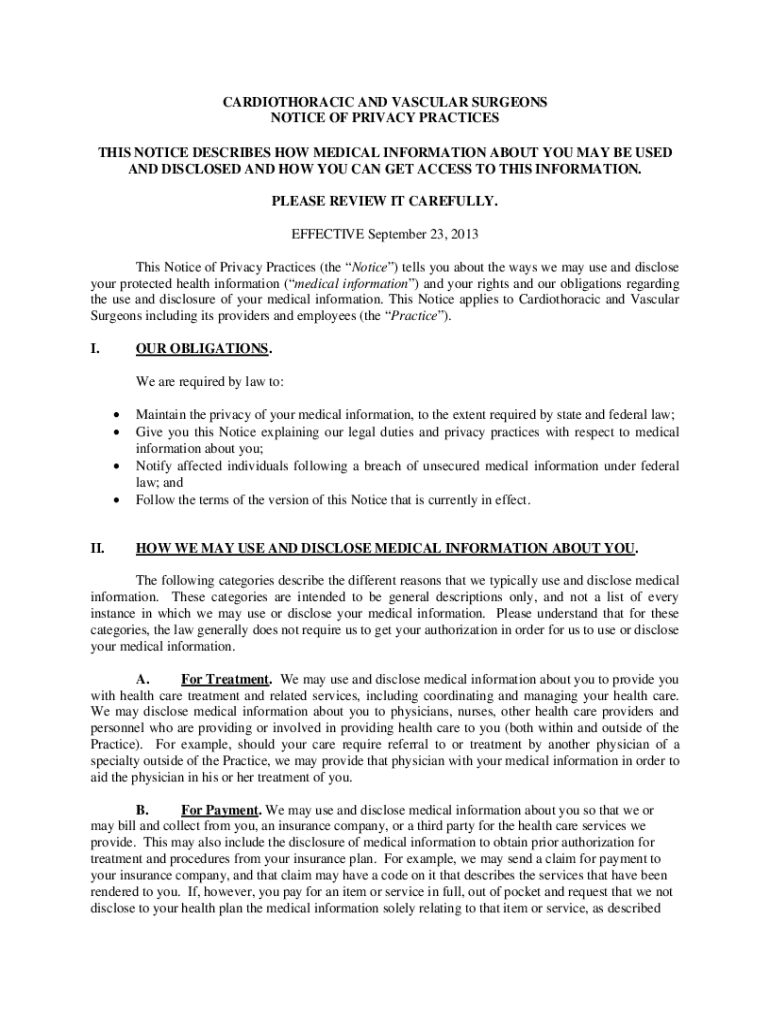 CARDIOTHORACIC AND VASCULAR SURGEONS NOTICE OF PRIVACY PRACTICES THIS NOTICE DESCRIBES HOW MEDICAL INFORMATION ABOUT YOU MAY BE USED AND DISCLOSED AND HOW YOU CAN GET ACCESS TO THIS INFORMATION. PLEASE