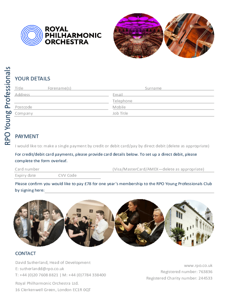 RPO Young ProfessionalsYOUR DETAILS Title AddressForename(s)Surname Email Telephone Mobile Job TitlePostcode CompanyPAYMENT I would like to: make a single payment by credit or debit card/pay by direct