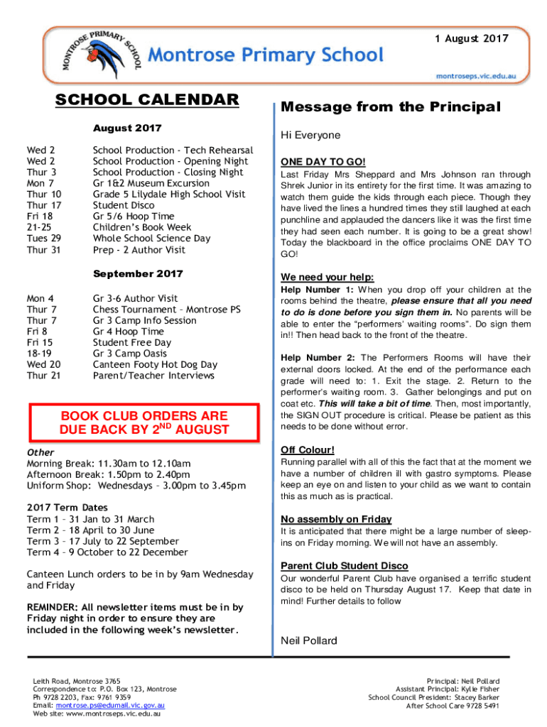 1 August 2017SCHOOL CALENDAR August 2017 Wed 2 Wed 2 Thur 3 Mon 7 Thur 10 Thur 17 Fri 18 2125 Tues 29 Thur 31School Production Tech Rehearsal School Production Opening Night School Production Closing