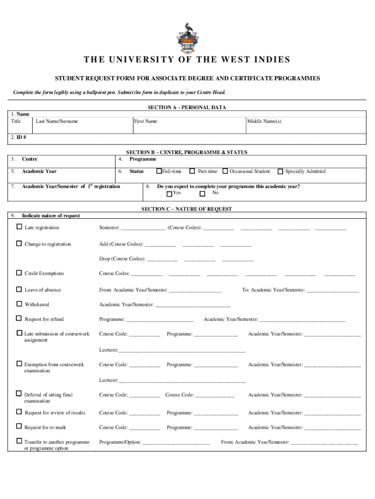 THE UNIVERSITY OF THE WEST INDIES STUDENT REQUEST FORM FOR ASSOCIATE DEGREE AND CERTIFICATE Programs Complete the form legibly using a ballpoint pen. Submit the form in duplicate to your Center Head.