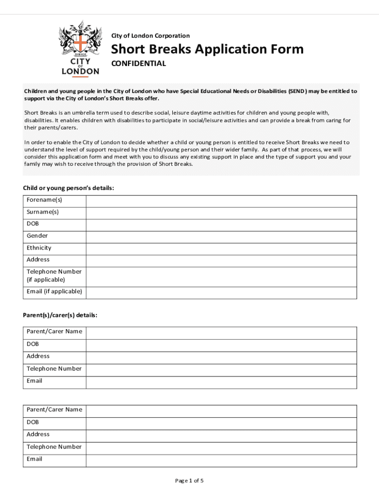 City of London Corporation Short Breaks Application Form CONFIDENTIAL Children and young people in the City of London who have Special Educational Needs or Disabilities (SEND) may be entitled to support