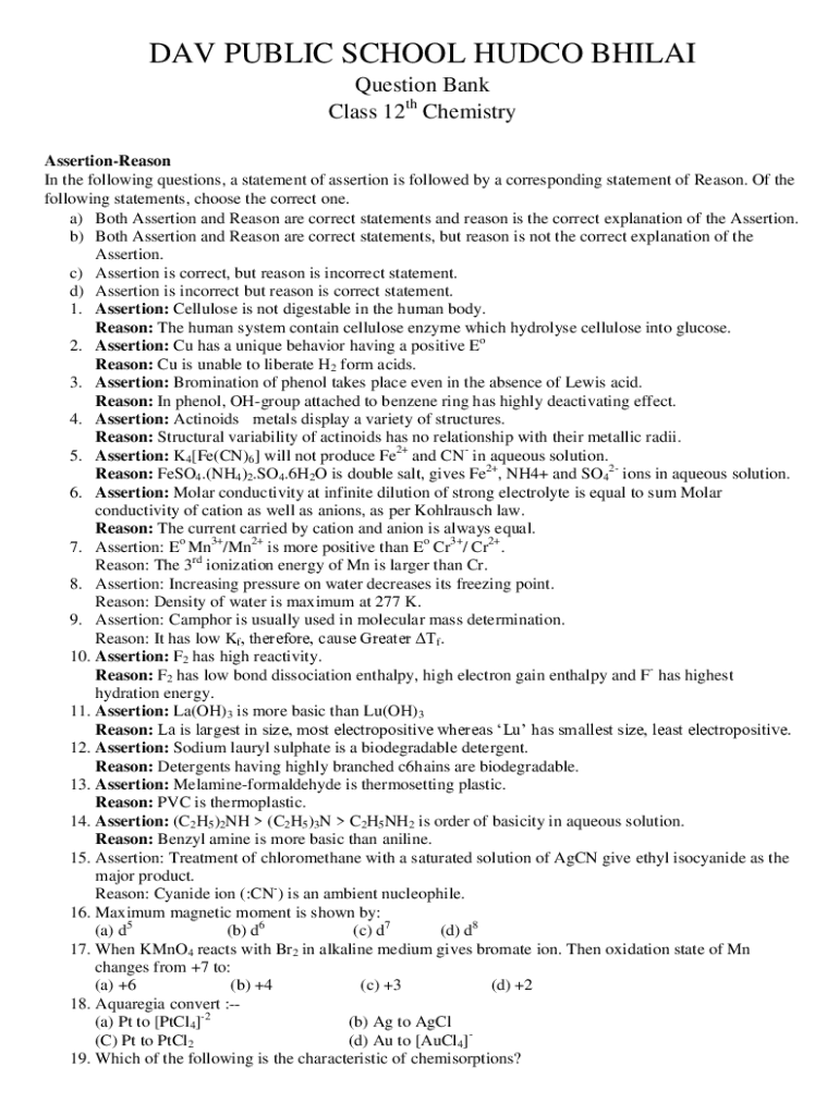DAV PUBLIC SCHOOL HU DCO BHILAI Question Bank Class 12th Chemistry AssertionReason In the following questions, a statement of assertion is followed by a corresponding statement of Reason. Of the following