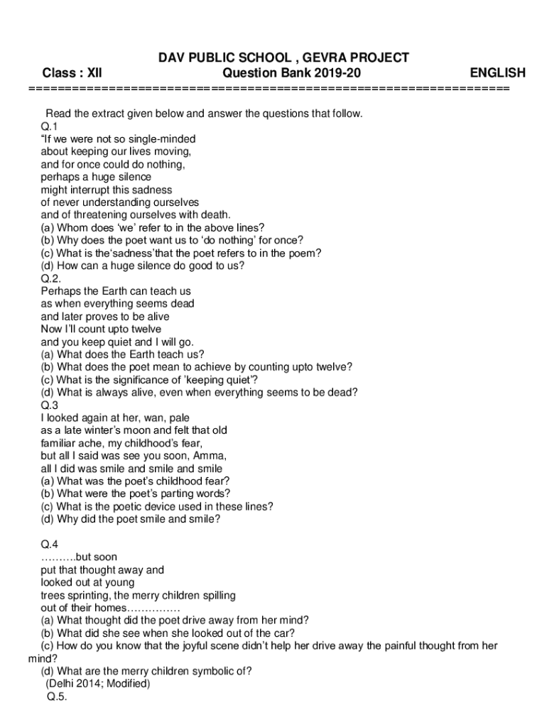 DAV PUBLIC SCHOOL, ERA PROJECT Class : XII Question Bank 201920 ENGLISH Read the extract given below and answer the questions that follow. Q.1 If we were not so single-minded about keeping our lives