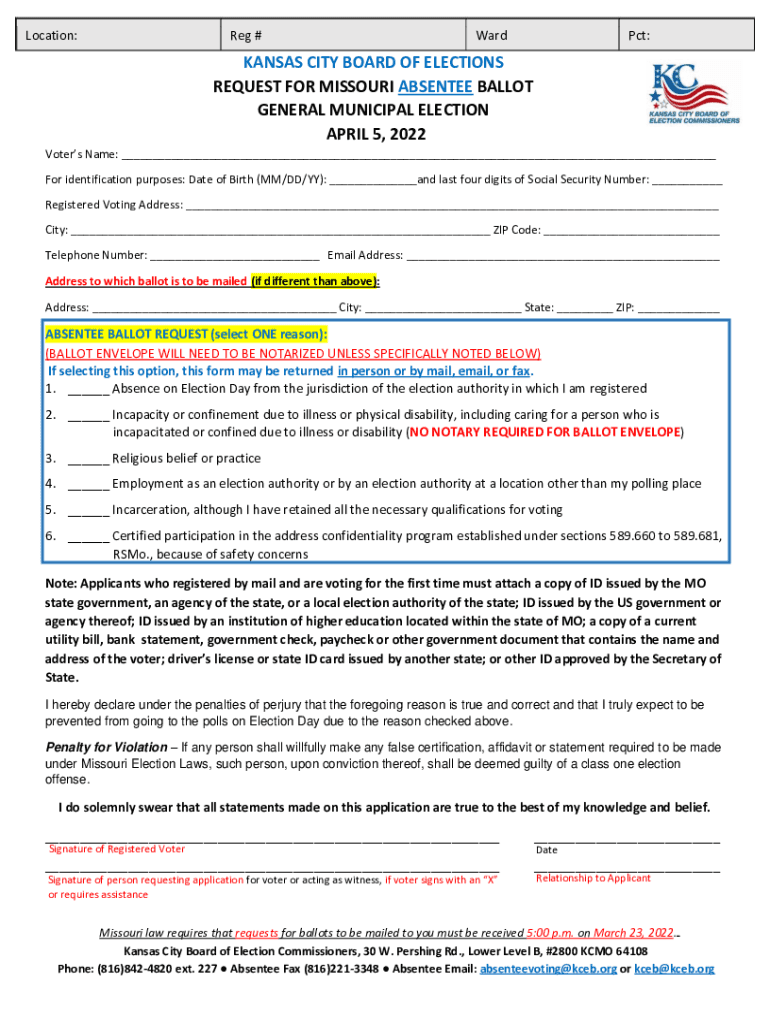 Location:Reg #Weirdest:KANSAS CITY BOARD OF ELECTIONS REQUEST FOR MISSOURI ABSENTEE BALLOT GENERAL MUNICIPAL ELECTION APRIL 5, 2022, Voters Name: ___ For identification purposes: Date of Birth (MM/DD/BY):