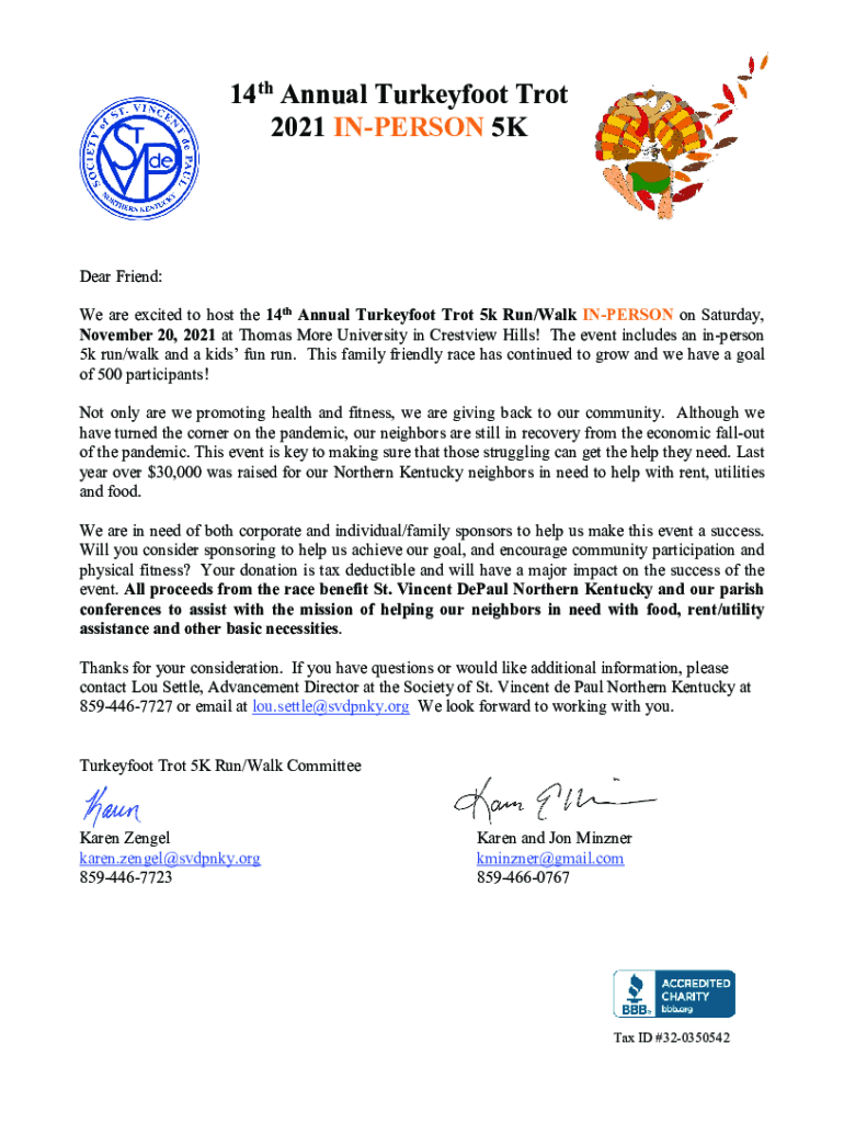 14th Annual Turkey foot Trot 2021 UNPERSON 5KDear Friend: We are excited to host the 14th Annual Turkey foot Trot 5k Run/Walk UNPERSON on Saturday, November 20, 2021, at Thomas More University in
