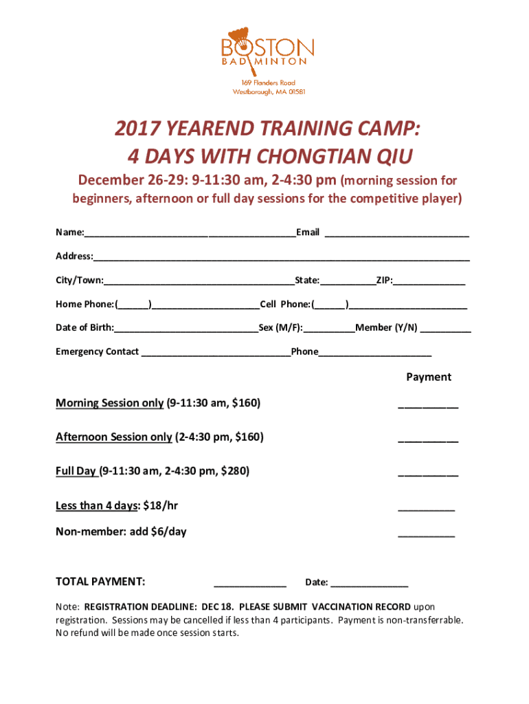2017 YEAREND TRAINING CAMP: 4 DAYS WITH CHRISTIAN AIU December 2629: 911:30 am, 24:30 pm (morning session for beginners, afternoon or full day sessions for the competitive player) Name:___Email ___