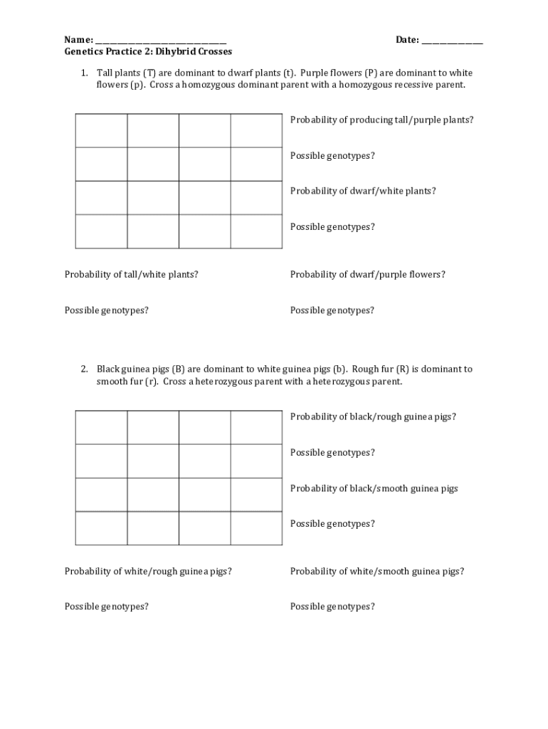 Name:___ GeneticsPractice2:DihybridCrossesDate:___1. Tall plants(T)aredominanttodwarfplants(t). Purple flowers(P)aredominanttowhite flowers(p). Crossahomozygousdominantparentwithahomozygousrecessiveparent.