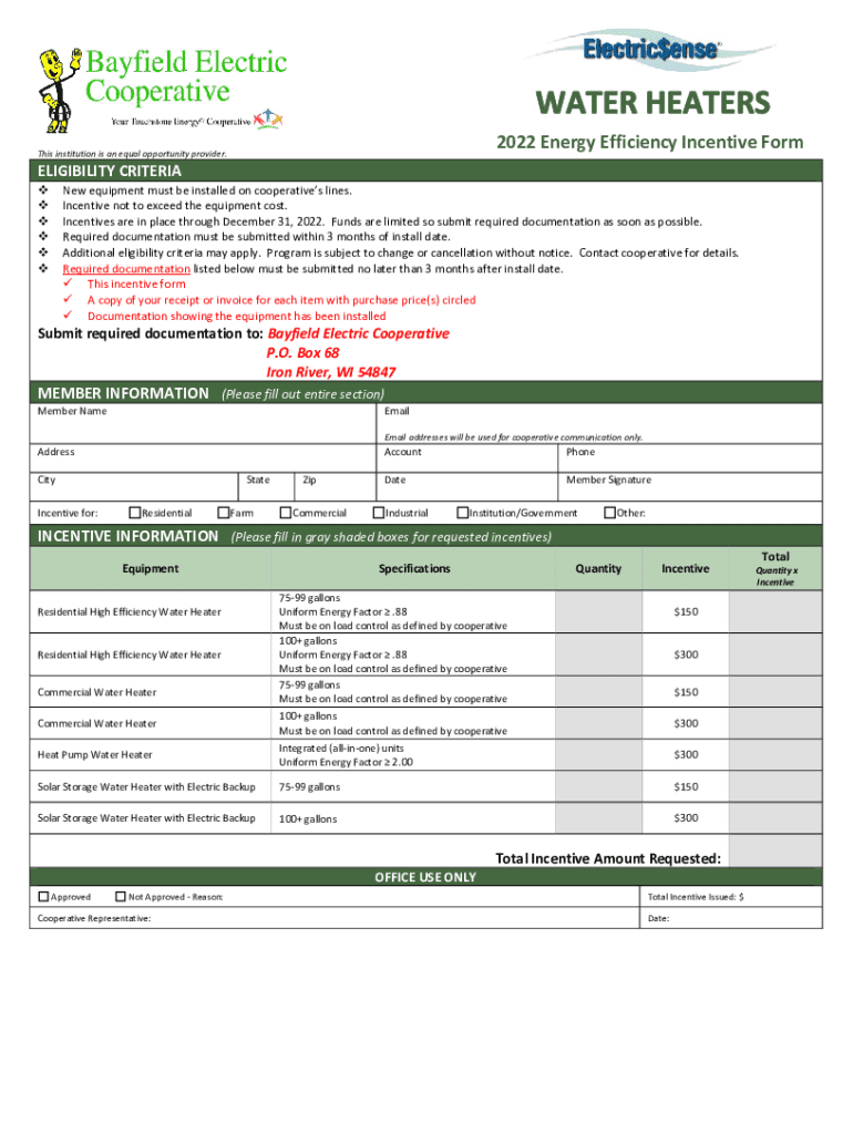 2022 Energy Efficiency Incentive Forms institution is an equal opportunity provider. ELIGIBILITY Criteria equipment must be installed on cooperatives lines. Incentive not to exceed the equipment cost.