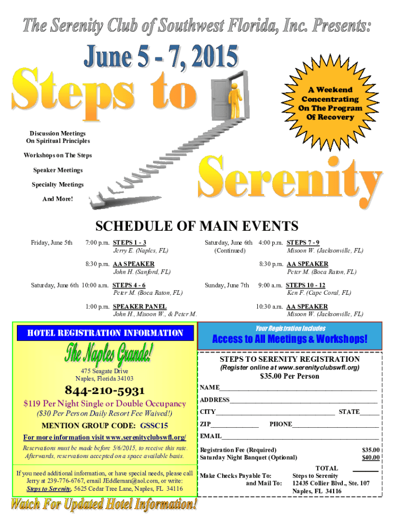 A Weekend Concentrating On The Program Of Recovery Discussion Meetings On Spiritual Principles Workshops on The Steps Speaker Meetings Specialty Meetings And More!SCHEDULE OF MAIN EVENTS Friday, June