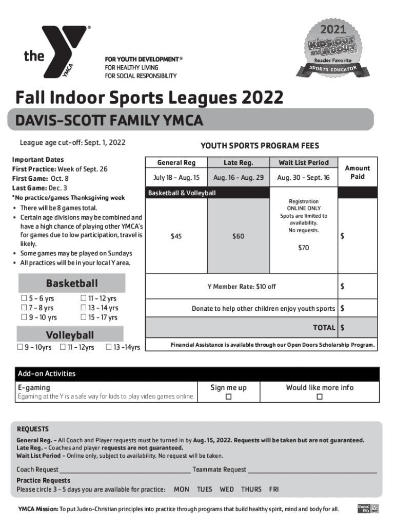 Fall Indoor Sports Leagues 2022 DAVISSCOTT FAMILY YMCALeague age cutoff: Sept. 1, 2022 Important Dates First Practice: Week of Sept. 26 First Game: Oct. 8 Last Game: Dec. 3 *No practice/games Thanksgiving