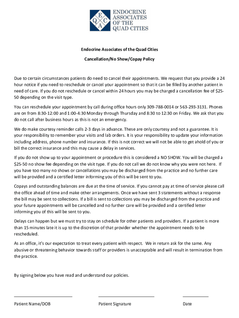 Endocrine Associates of the Quad Cities Cancellation/No Show/Copay Police to certain circumstances patients do need to cancel their appointments. We request that you provide a 24-hour notice if you