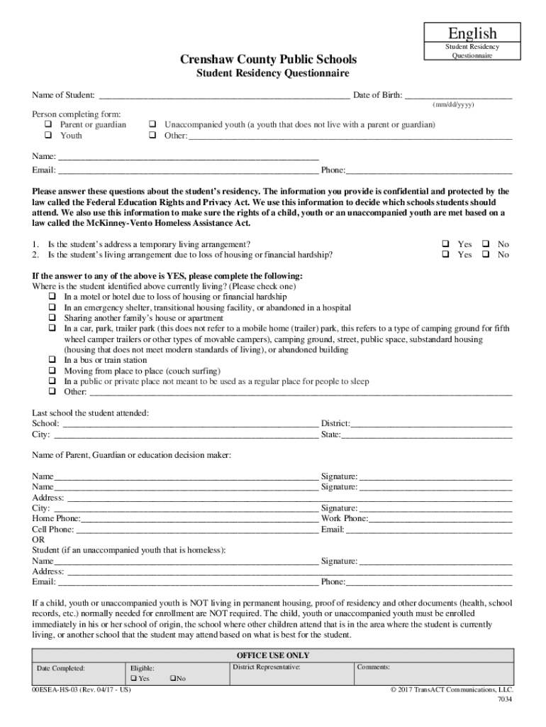 English Student Residency QuestionnaireCrenshaw County Public Schools Student Residency QuestionnaireName of Student: ___ Date of Birth: ___ (mm/dd/YYY)Person completing form: Parent or guardian Youth