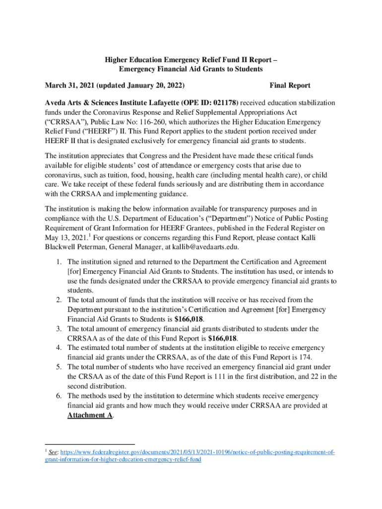 Higher Education Emergency Relief Fund II Report Emergency Financial Aid Grants to Students March 31, 2021 (updated January 20, 2022)Final Reported Arts & Sciences Institute Lafayette (OPE ID: 021178)