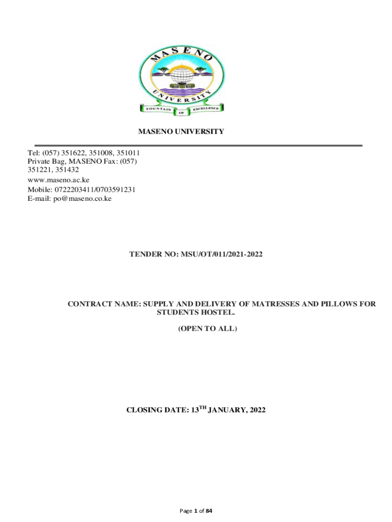 CASINO UNIVERSITY Tel: (057) 351622, 351008, 351011 Private Bags, CASINO Fax: (057) 351221, 351432 www.maseno.ac.ke Mobile: 0722203411/0703591231 Email: po@maseno.co.keTENDER NO: MSU/OT/011/20212022CONTRACT