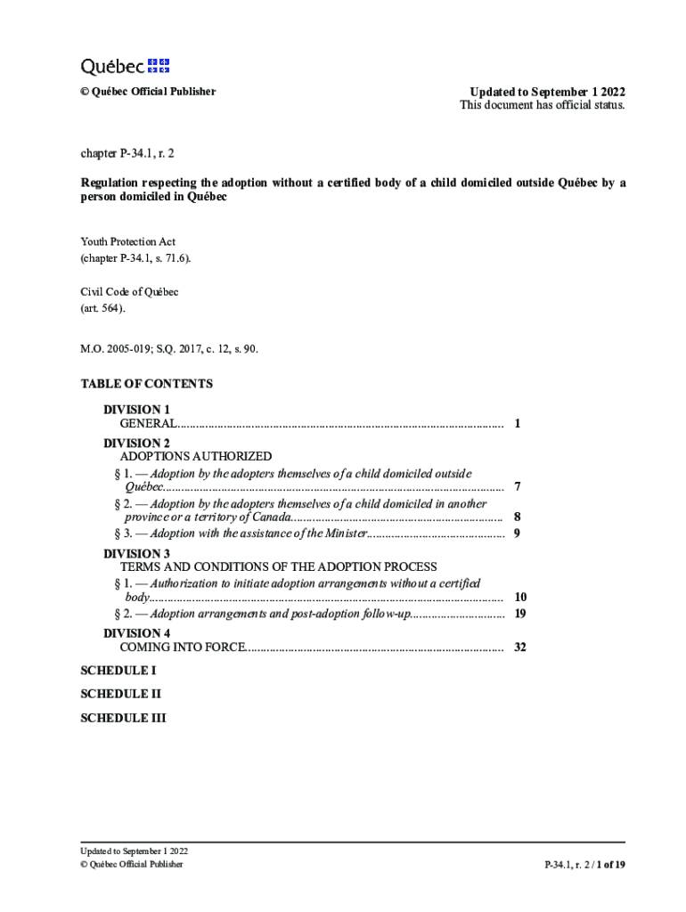 Quebec Official Publisher0 0 9 1 Updated to September 1, 2022, This document has official status. Chapter P34.1, r. 2 Regulation respecting the adoption without a certified body of a child domiciled
