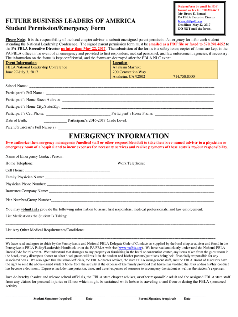 Return form by email in PDF format or fax to: 570.398.4652 Mr. Bruce E. Local PA FBLA Executive Director bboncal@pafbla.us Deadline: May 22, 2017, DO NOT mail the forms. FUTURE BUSINESS LEADERS OF