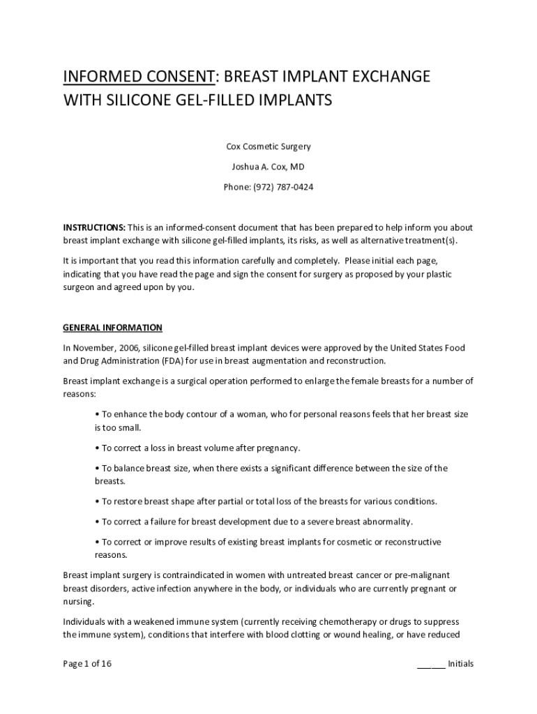INFORMED CONSENT: BREAST IMPLANT EXCHANGE WITH SILICONE FULFILLED IMPLANTS Cox Cosmetic Surgery Joshua A. Cox, MD Phone: (972) 7870424INSTRUCTIONS: This is an informed consent document that has been