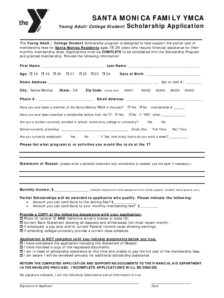SANTA MONICA FAMILY YMCA Young Adult/College StudentScholarship Application Young Adult / College Student Scholarship program is designed to help support the partial cost of membership fees for Santa