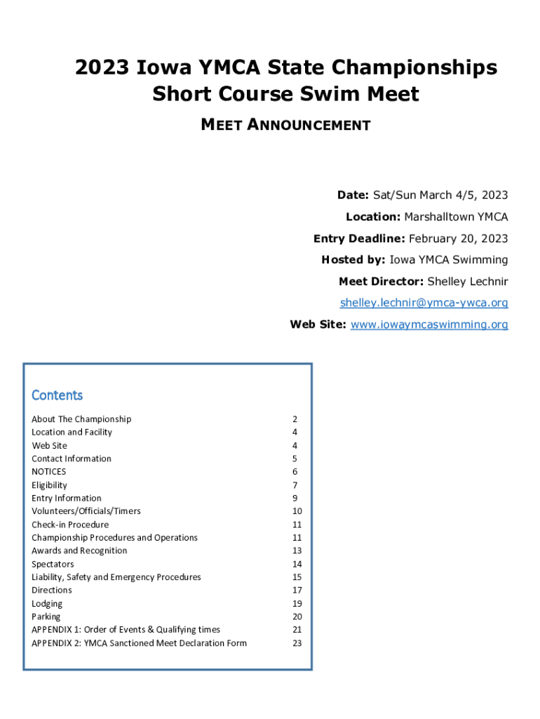 2023 Iowa YMCA State Championships Short Course Swim Meet ANNOUNCEMENTDate: Sat/Sun March 4/5, 2023 Location: Marshalltown YMCA Entry Deadline: February 20, 2023, Hosted by: Iowa YMCA Swimming Meet