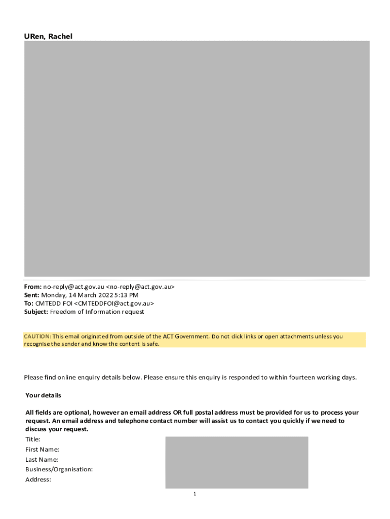 Urn, RachelFrom: noreply@act.gov.au Sent: Monday, 14 March 2022 5:13 PM To: CMT EDD FOR CMTEDDFOI@act.gov.au Subject: Freedom of Information request CAUTION: This email originated from outside the