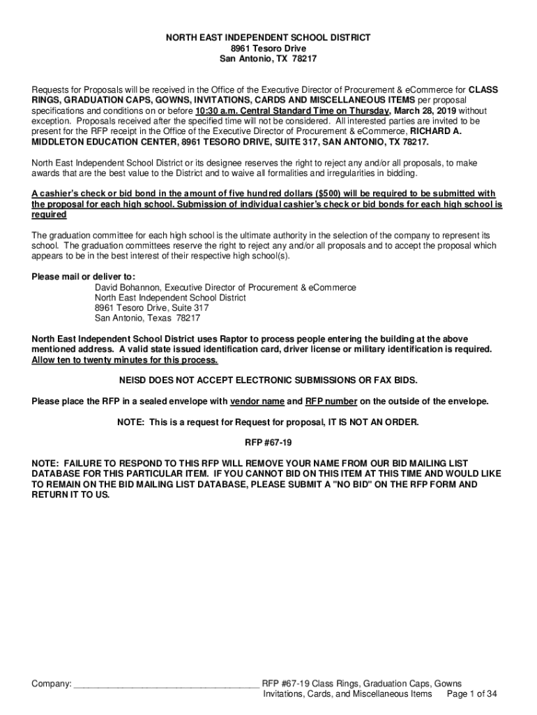 NORTH EAST INDEPENDENT SCHOOL DISTRICT 8961 Resort Drive San Antonio, TX 78217Requests for Proposals will be received in the Office of the Executive Director of Procurement & e-commerce for CLASS