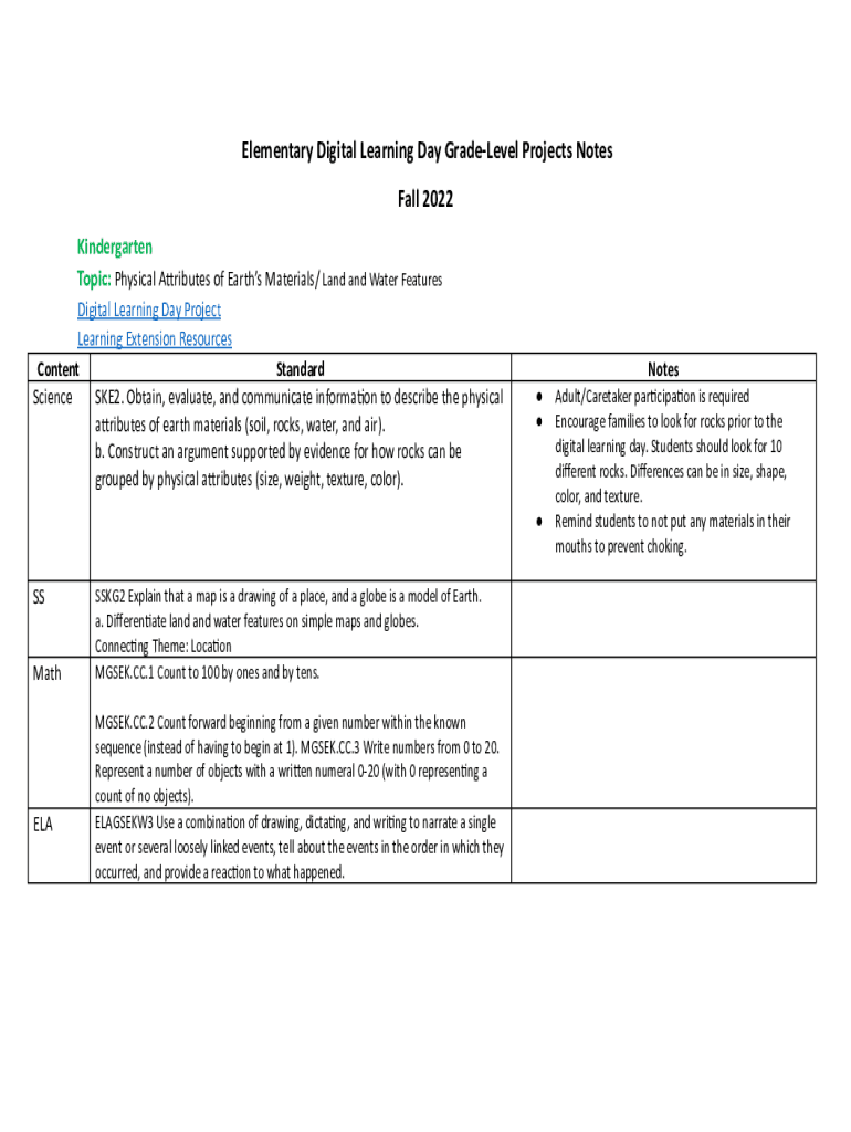 Elementary Digital Learning Day GradeLevel Projects Notes Fall 2022 Kindergarten Topic: Physical A tribute of Earths Materials/ Land and Water Features Digital Learning Day Project Learning Extension