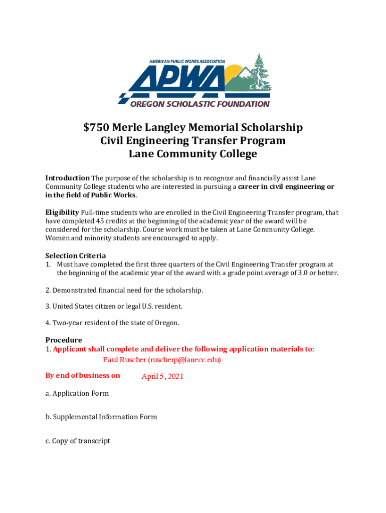 $750 Merle Langley Memorial Scholarship Civil Engineering Transfer Program Lane Community College Introduction The purpose of the scholarship is to recognize and financially assist Lane Community