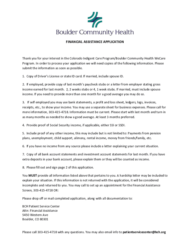 FINANCIAL ASSISTANCE APPLICATIONThank you for your interest in the Colorado Indigent Care Program/Boulder Community Health Where Programmed. In order to process your application we will need copies