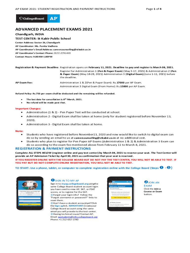 AP EXAM 2021: STUDENT REGISTRATION AND PAYMENT INSTRUCTIONS Page 1 of 4ADVANCED PLACEMENT EXAMS 2021 Chandigarh, INDIA TEST CENTER: St Air Public School Center Address: Sector 26, Chandigarh AP Coordinator: