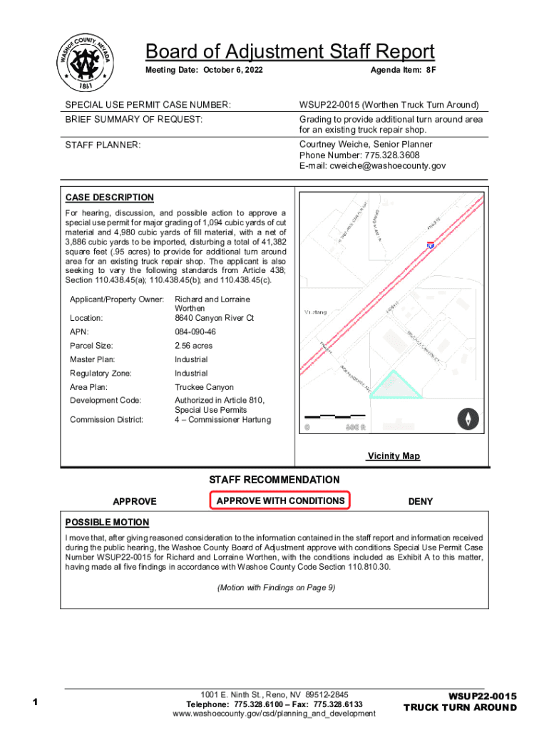 Board of Adjustment Staff Report Meeting Date: October 6, 2022Agenda Item: 8FSPECIAL USE PERMIT CASE NUMBER:WSUP220015 (Wort hen Truck Turn Around)BRIEF SUMMARY OF REQUEST:Grading to provide additional