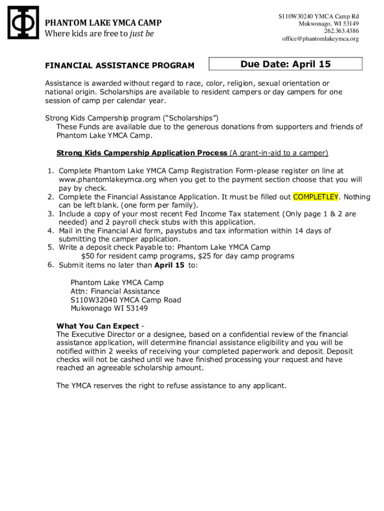 PHANTOM LAKE YMCA CAMP Where kids are free to just be FINANCIAL ASSISTANCE PROGRAMS110W30240 YMCA Camp Rd Mukwonago, WI 53149 262.363.4386 office@phantomlakeymca.orgDue Date: April 15Assistance is