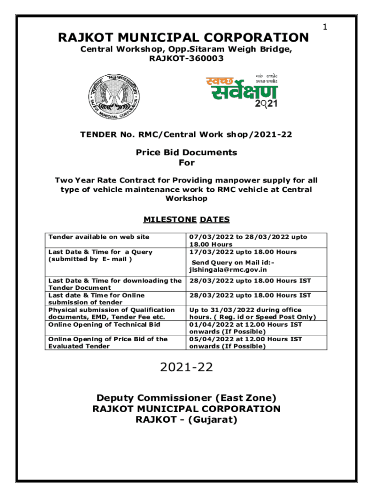 RAJKOT MUNICIPAL CORPORATION Central Workshop, Opp. Sitar am Weigh Bridge, RAJKOT360003TENDER No. RMC/Central Work shop/202122Price Bid Documents For Two Year Rate Contract for Providing manpower
