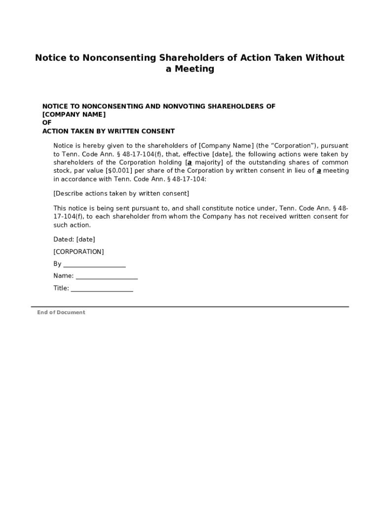 Notice to Nonconsenting Shareholders of Action Taken Without a ... template instructions