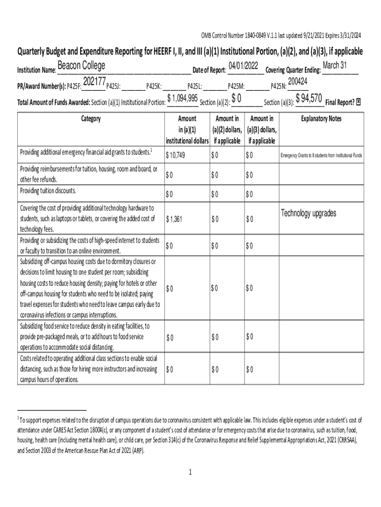 OMB Control Number 18400849 V.1.1 last updated 9/21/2021 Expires 3/31/2024QuarterlyBudgetandExpenditureReportingforHEERFI,II, Andrei(a)(1)Institutionalization, (a)(2), and(a)(3), inapplicable March