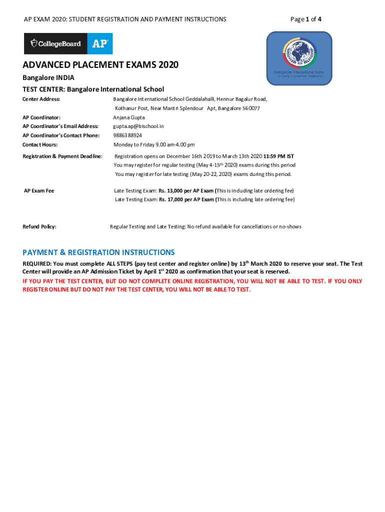 AP EXAM 2020: STUDENT REGISTRATION AND PAYMENT INSTRUCTIONS Page 1 of 4ADVANCED PLACEMENT EXAMS 2020 Bangalore INDIA TEST CENTER: Bangalore International School Center Address:Bangalore International