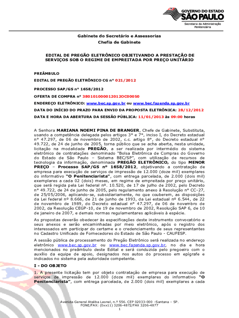 Cabinet do Secretion e Assessors Chef de Gabinete EDIT AL DE PRESO ELECTRIC OBJETIVANDO A PRESTO DE SERVOS SOB O REGIME DE EMPREITADA POR PRO UNITRIOPREMBULO EDIT AL DE PRESO ELECTRIC CG n 021/2012