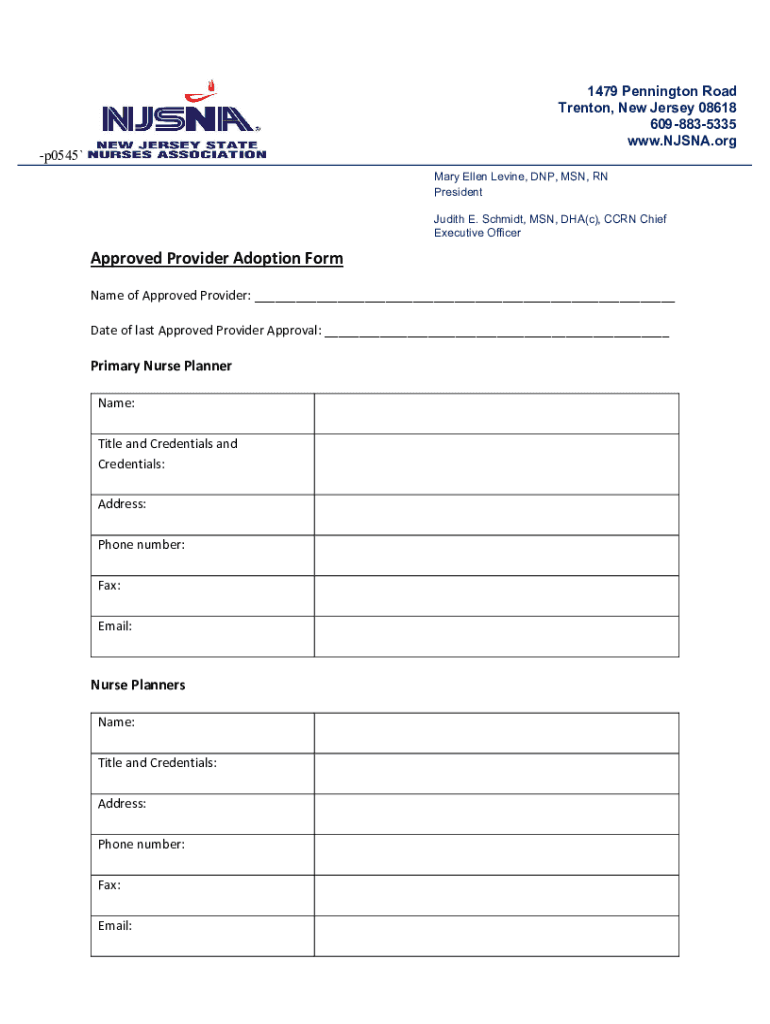 1479 Pennington Road Trenton, New Jersey 08618 6098835335 www.NJSNA.orgp0545`Mary Ellen Levine, DNP, MSN, RN President Judith E. Schmidt, MSN, DHA(c), CORN Chief Executive OfficerApproved Provider