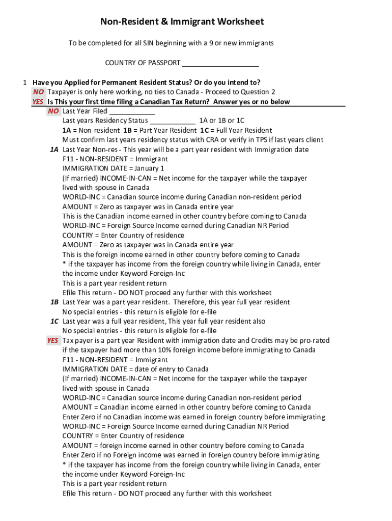 Nonresident & Immigrant Worksheet To be completed for all SIN beginning with a 9 or new immigrants COUNTRY OF PASSPORT ___ 1 Have you Applied for Permanent Resident Status? Or do you intend to? NO