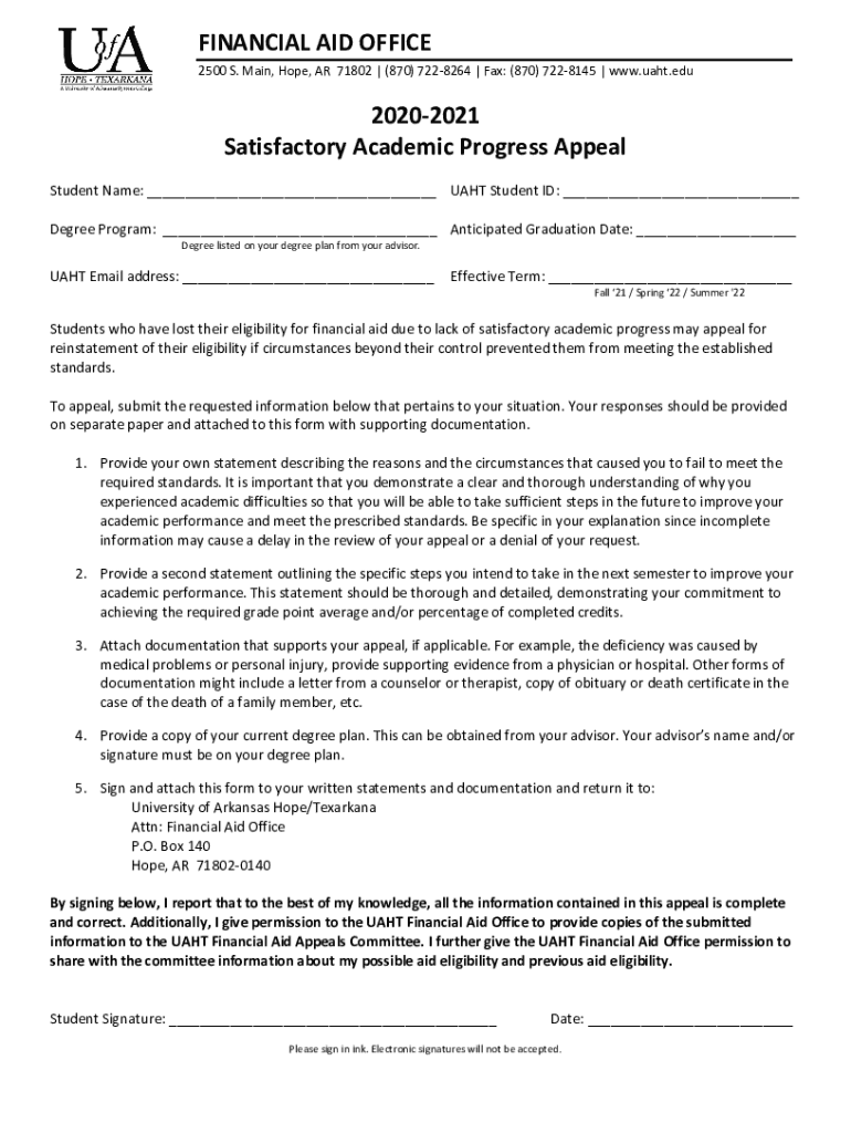 FINANCIAL AID OFFICE 2500 S. Main, Hope, AR 71802 | (870) 7228264 | Fax: (870) 7228145 | www.uaht.edu20202021 Satisfactory Academic Progress Appeal Student Name: ___ BAHT Student ID: ___ Degree Program: