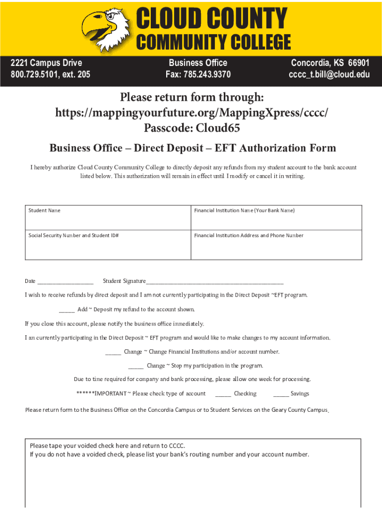 CLOUD COUNTYCOMMUNITY COLLEGE2221 Campus Drive800.729.5101, ext. 205Business OfficeMax: 785.243.9370Concordia, KS 66901 cccc_t.bill@cloud.eduPlease return form through: CLOUD COUNTY COMMUNITY COLLEGE