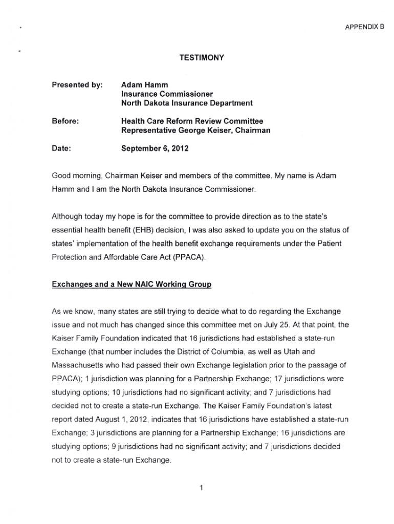 APPENDIX BTESTIMONYPresented by:Adam Hamm Insurance Commissioner North Dakota Insurance DepartmentBefore:Health Care Reform Review Committee Representative George Laser, ChairmanDate:September 6,