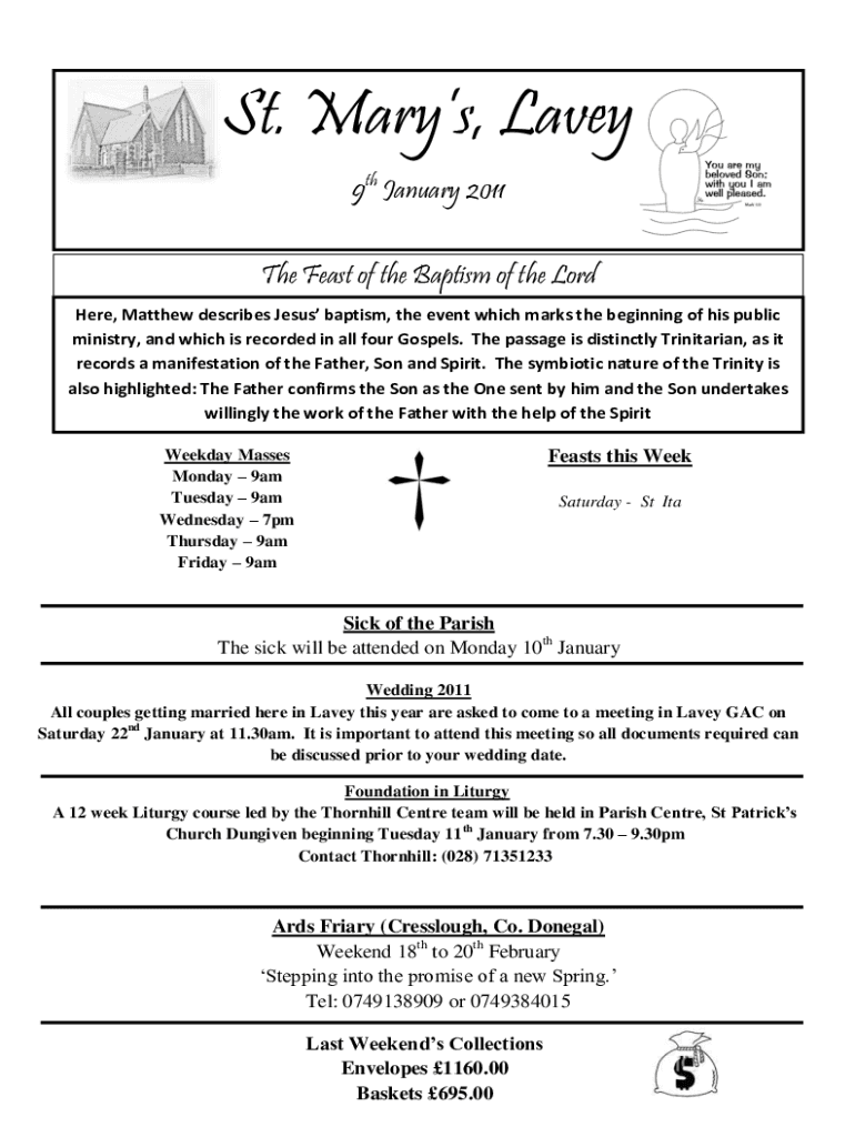 St. Mary's, Lava 9th January 2011 The Feast of the Baptism of the Lord Here, Matthew describes Jesus baptism, the event which marks the beginning of his public ministry, and which is recorded in all