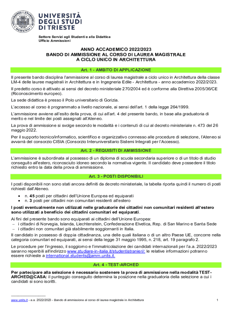 Set tore Service Agni Students e alley Didactic Office AmmissioniANNO ACADEMIC 2022/2023 BAND ODI ADMISSION AL TORSO DI LAURA MAGISTRATE A CIC LO UNIDO IN ARCHITECTURE Art. 1 AMBIT ODI APPLICATION